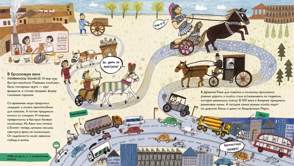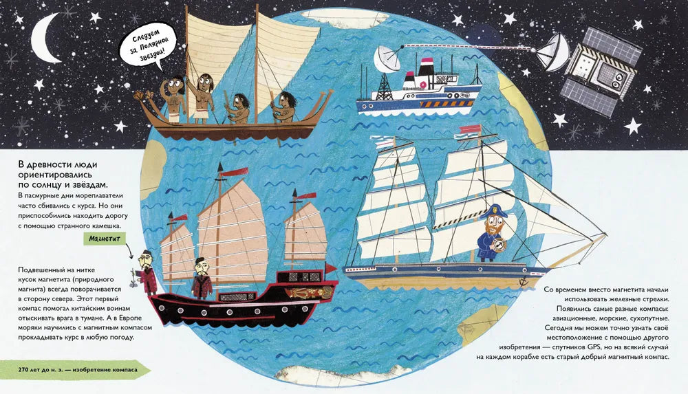 Нас окружают невероятные ИЗОБРЕТЕНИЯ. Мы настолько к ним привыкли, что даже не можем представить жизнь без них. А знаешь ли ты, когда они появились? С чего всё началось? Открывай скорее эту книгу и отправляйся в путешествие по эпохам и континентам, чтобы узнать, какие изобретения изменили ход нашей истории — от колеса до марсохода, от магнита к GPS, знакомься с изобретателями бумаги, часов, вакцин, двигателей, компьютера…