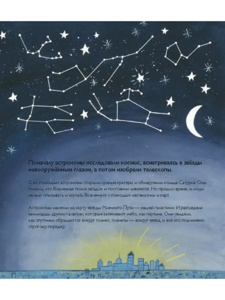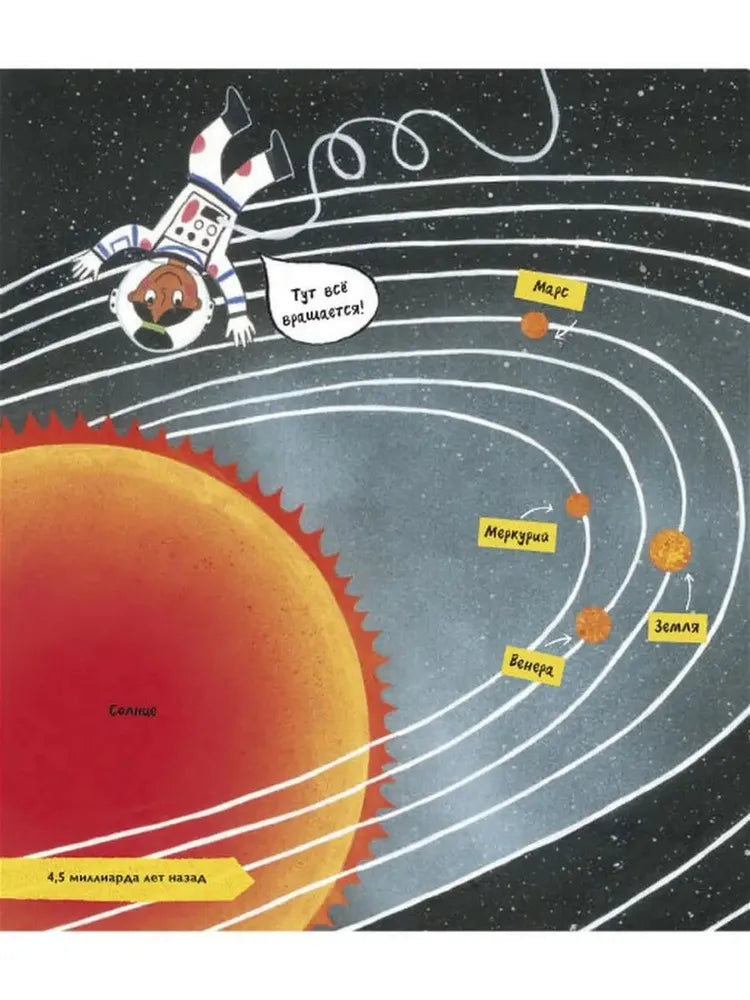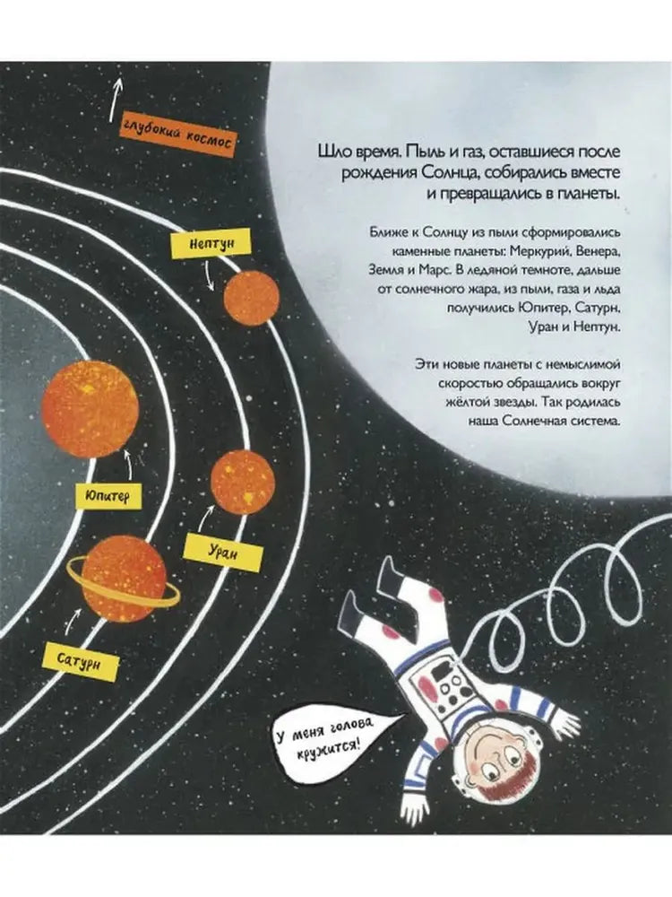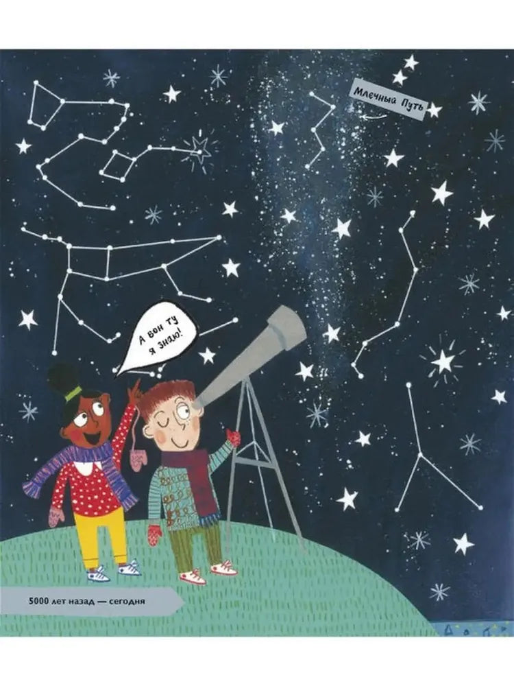 Мальчик и девочка совершают путешествие во времени, становясь свидетелями событий вселенского масштаба — от Большого взрыва до постройки Международной космической станции. Эта красочная книга кратко и увлекательно дает понятие об основах астрономии: об образовании планет, астероидах, кометах и гравитации, а также о покорении космоса в XX веке. Герои уверены: скоро можно будет летать в космос на каникулы и познакомиться с внеземными цивилизациями.
