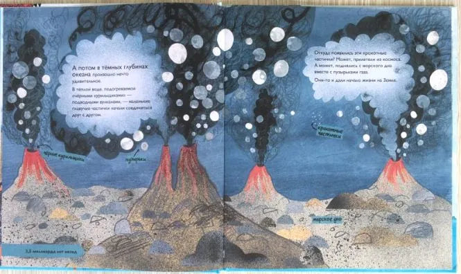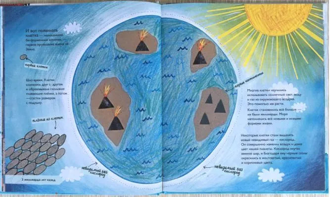 Эколог Кэтрин Барр и биолог Стив Уильямс умудрились с гениальной простотой донести до читателей-дошкольников сложнейший материал: в несколько строк под картинками описали, как извергались вулканы на земле и под водой, как метеориты падали в океан и как в теплой воде зародилась жизнь. Как вымерли первые живые существа и появились динозавры. Как совершился Большой Взрыв и наша планета погрузилась во тьму — и так далее. Иллюстрации, словно бы нарисованные ребенком, далеко не наивны (хотя очень забавные). Книга отчасти напоминает комикс. А вот ироничный текст, словно взрослый дурачится с ребенком, рассказывает о вещах серьезных. Главный посыл: люди, как и всё живое, будут развиваться и дальше. И очень важно уберечь планету от катастроф, причиной которых мы можем стать.