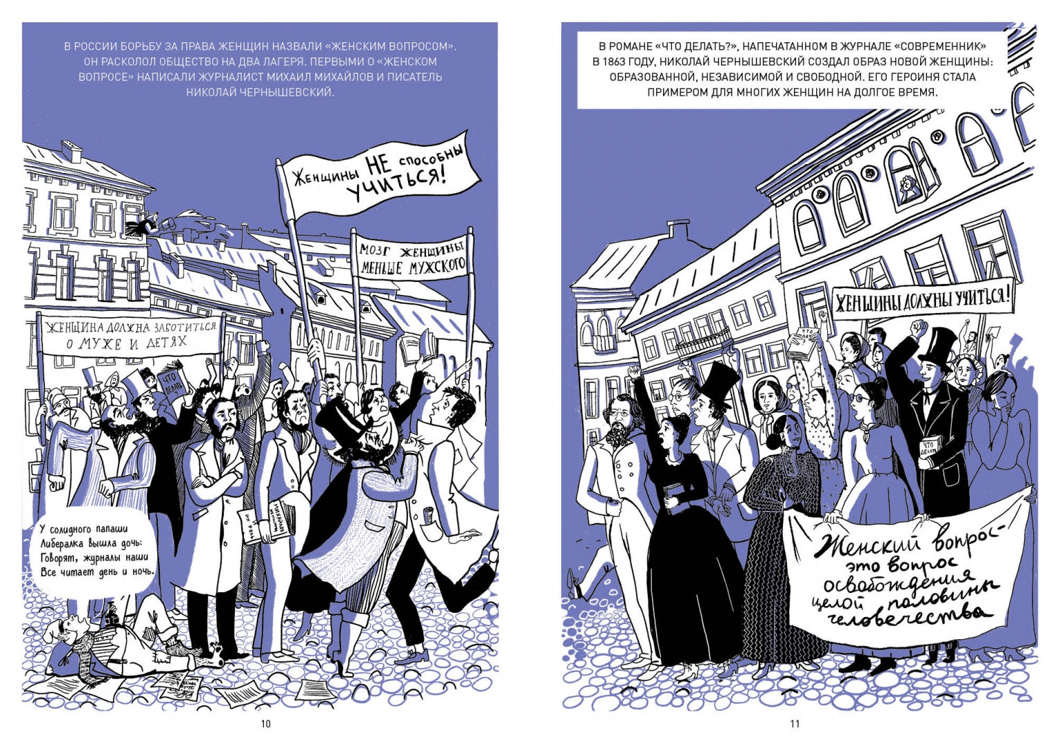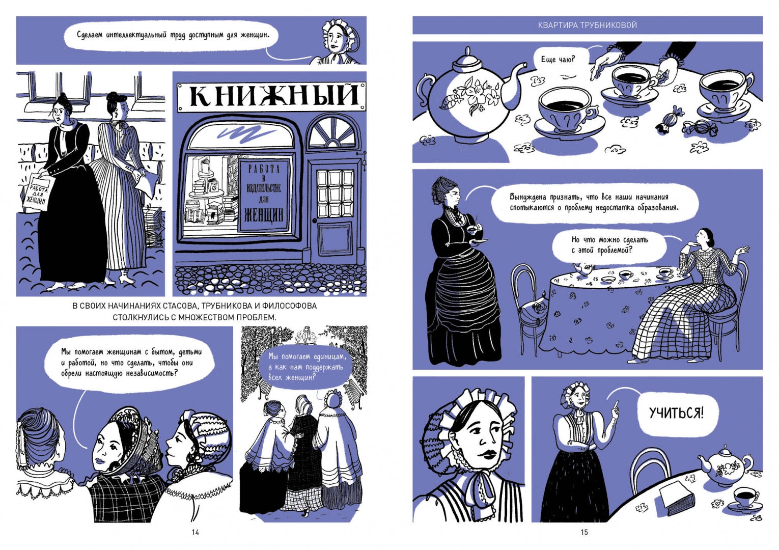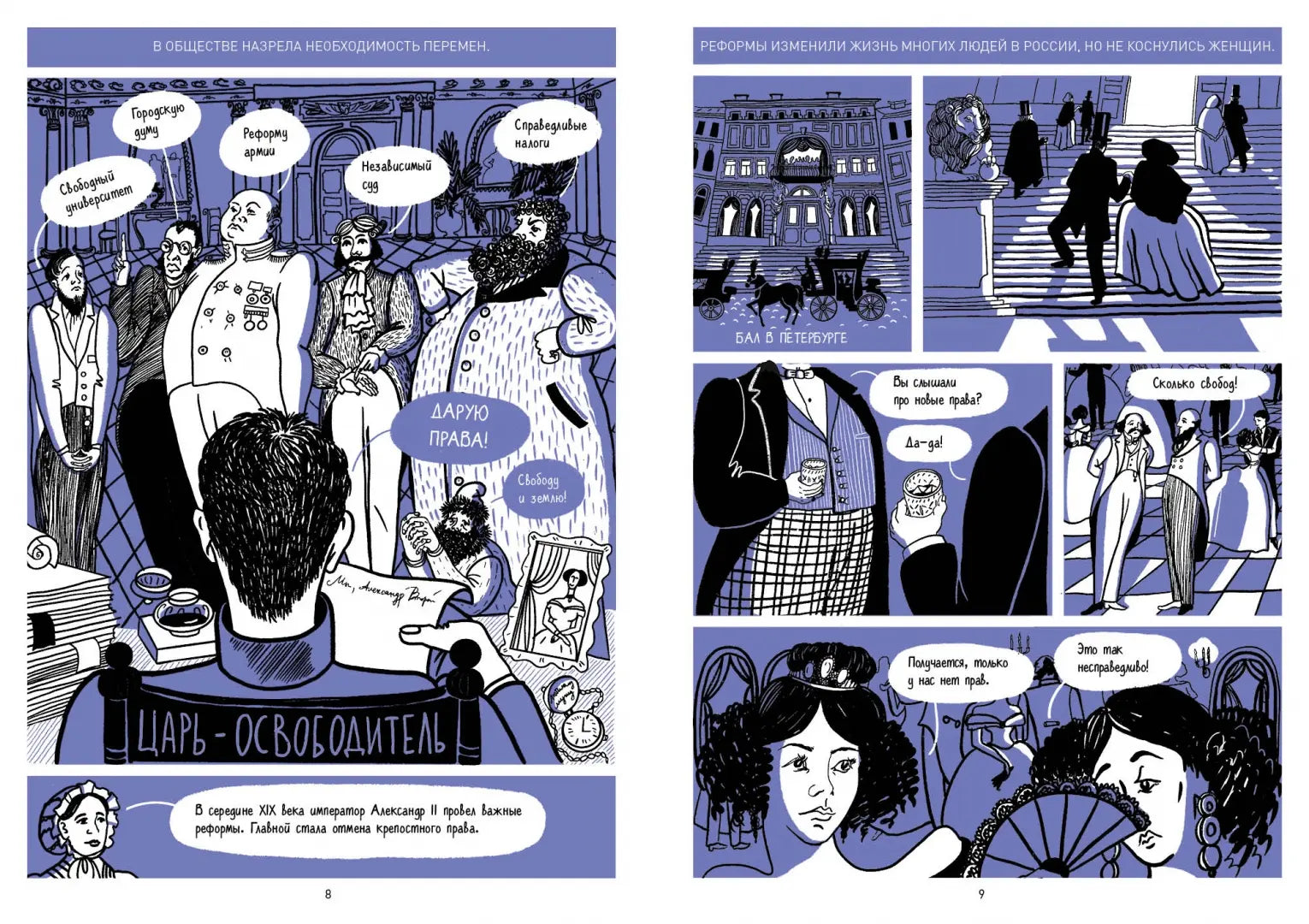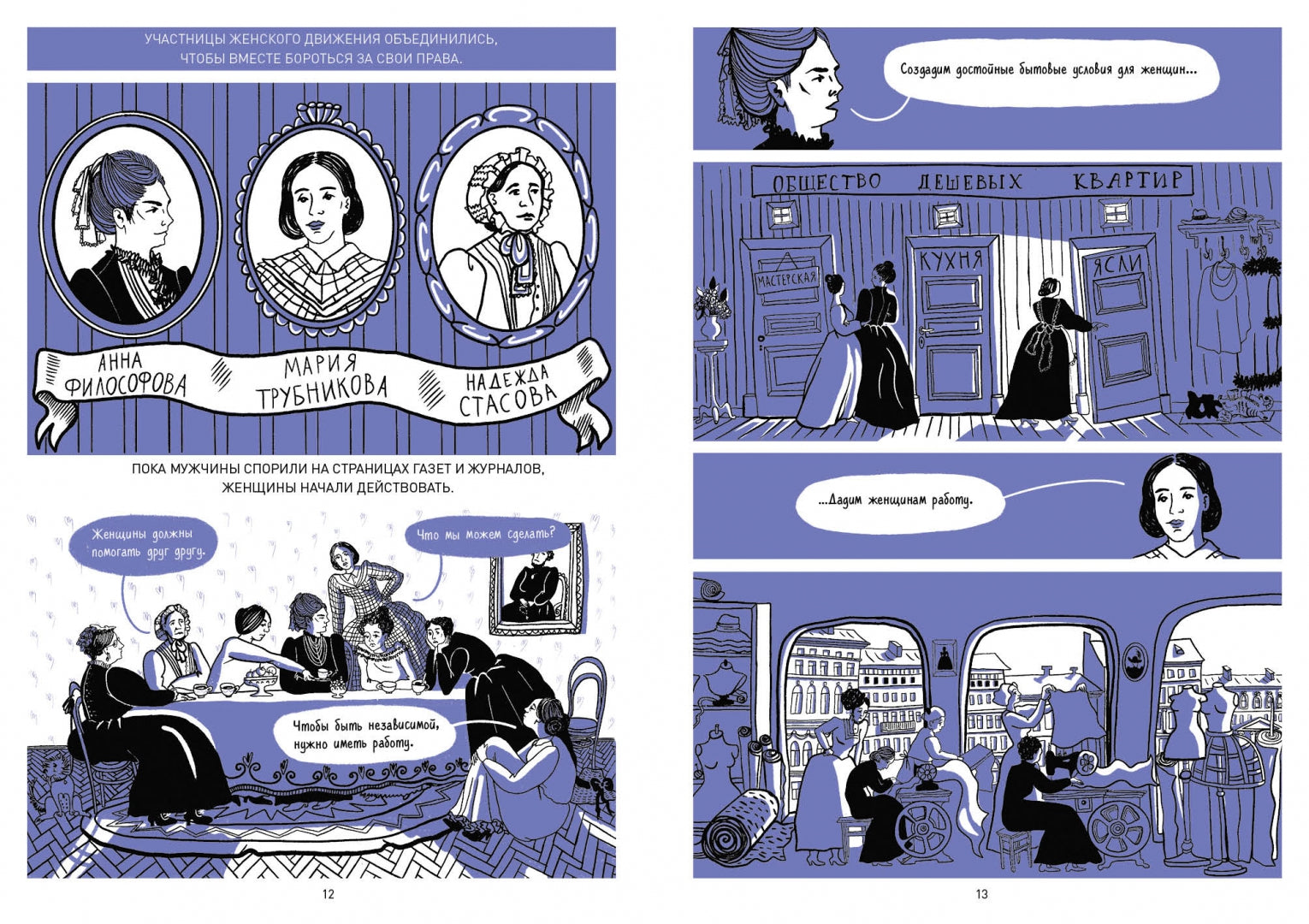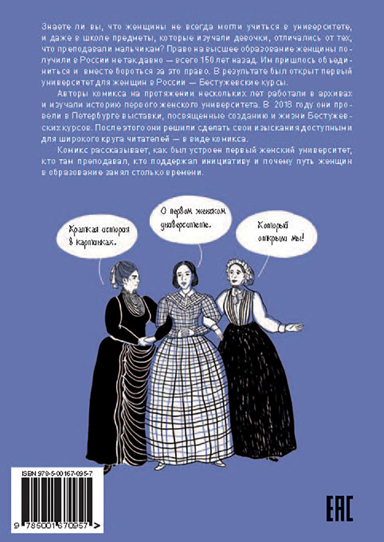 Комикс рассказывает о том, как в XIX веке три женщины создали первый университет для женщин в Санкт-Петербурге. В книге описывается их борьба за право учиться, получать высшее образование и работать. Вы также узнаете, как были устроены Бестужевские курсы, кто там преподавал, кто поддержал инициативу, и почему путь женщин в образование занял полвека.