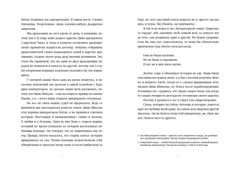 Цинь Шихуан и Ян Пу. Оба они унаследовали ремесла отцов: один стал тираном, другой — летописцем. Один творит беззакония, другому суждено свидетельствовать о них. Цинь Шихуан одержим бессмертием. Ян Пу одержим страхом и историями, что одолевают его, как призраки. Цинь Шихуан не знает, что бессмертие — это выдумка. А Ян Пу всегда это знал. Ведь его дело — рассказывать истории, свои и чужие, настоящие и вымышленные.