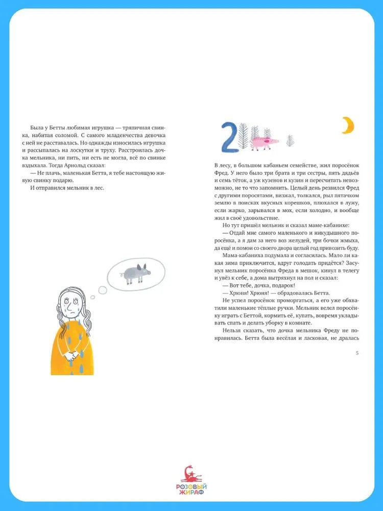 Жил-был маленький поросенок, а родичи взяли да и отдали его в няньки к мельниковой дочке Бетте. Если бы он только знал, что ждет его впереди! Уже вскоре он будет гнаться за волками, укравшими девочку, по дороге встретит кабана-колдуна, крысу, которая окажется ежихой, лося, мечтающего стать слоном... И ринется в волчье логово, только чтобы спасти подружку.