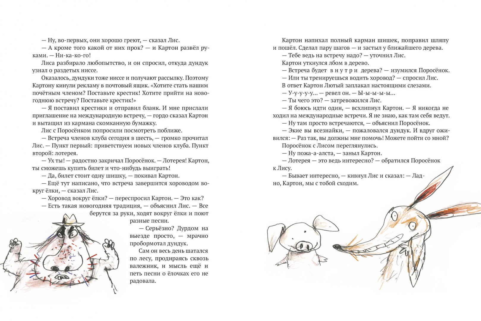 Картон Лютый заделался почётным членом клуба ниссе. И даже получил приглашение на новогоднюю встречу. Международную, между прочим. На таких важных мероприятиях дундук и не бывал никогда, идти самому боязно. Может, Лис с Поросёнком составят ему компанию? Друзья охотно соглашаются: там ведь будет лотерея с подарками и хоровод вокруг ёлки. Вот только приходить на праздник отчего-то нужно раздетым, без свитера…