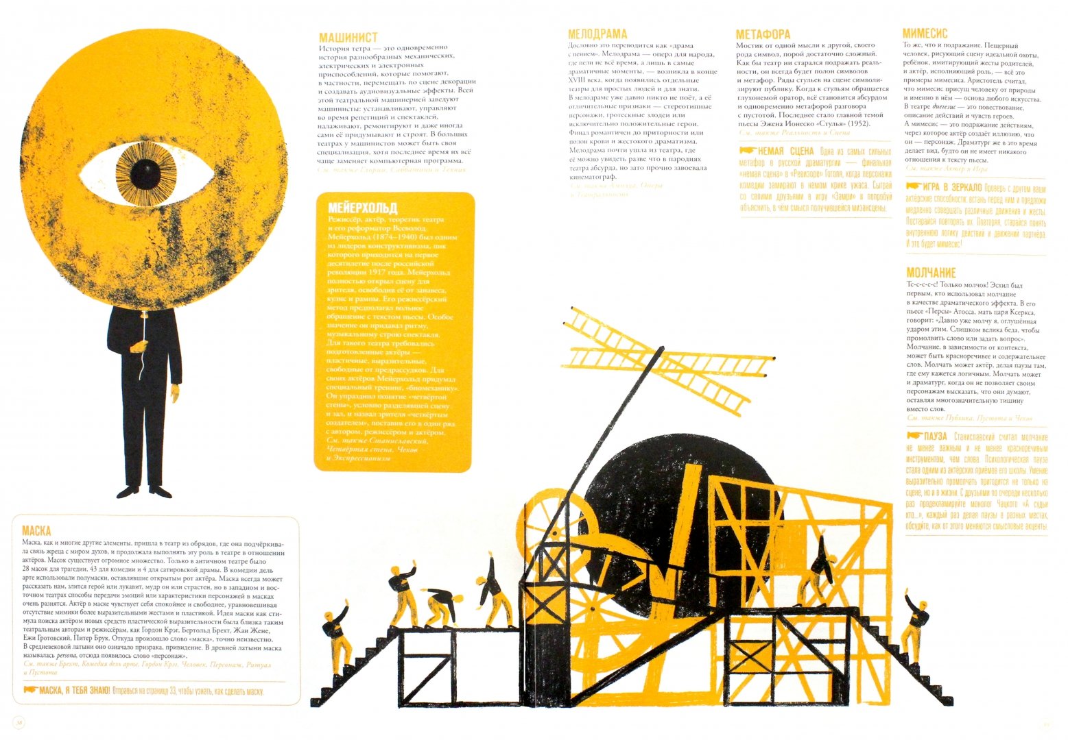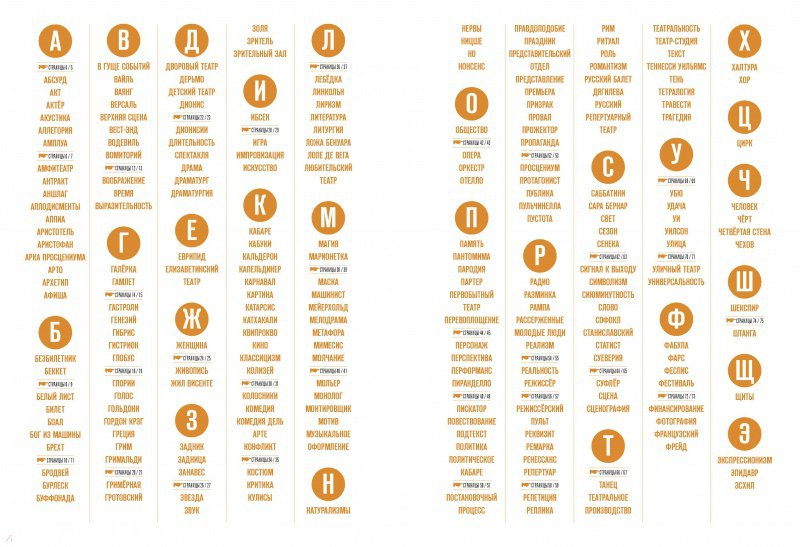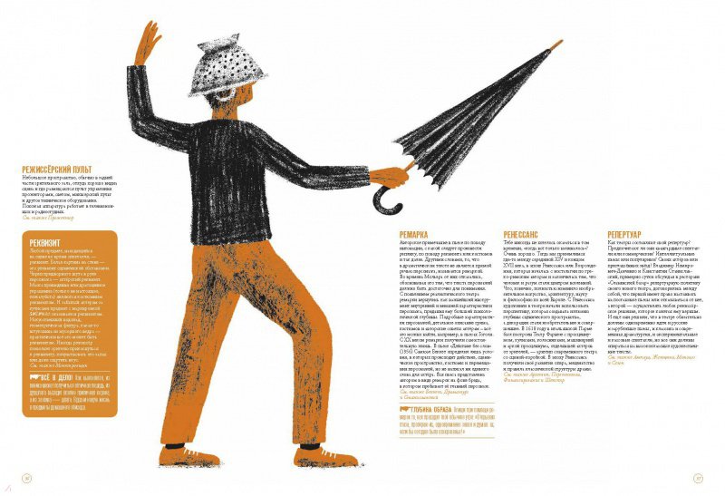 БЕЗБИЛЕТНИК, ПЕРФОРМАНС, СЦЕНА, АНШЛАГ, ЛОЖА БЕНУАРА, МЕЙЕРХОЛЬД, КУЛИСЫ, РЕКВИЗИТ, ДИОНИС. И еще более 200 слов о театре, драматургах, актёрах и режиссёрах собраны в этой книге. Это словарь — потому что театральные термины, которыми пользуются люди во всём мире, собраны тут от А до Я. Эти слова пришли из Древней Греции, из Франции эпохи Просвещения, оттуда, где зародилась и развивалась драматургия, режиссура и актёрское мастерство. Наш черёд наступил в ХХ веке, когда Русские сезоны Дягилева своими новшествами обогатили не только театр, но и мировое искусство в целом, Станиславский и Мейерхольд разработали системы подготовки актёров к роли, а Чехов написал пьесы, которые вот уже более ста лет идут на сценах всех континентов. А ещё это тетрадь с заданиями. Почти в каждой статье можно найти подсказки, советы или упражнения для развития актёрских навыков, а на специальных разворотах — мастер-классы по изготовлению маски, декорации, кукол, грим.